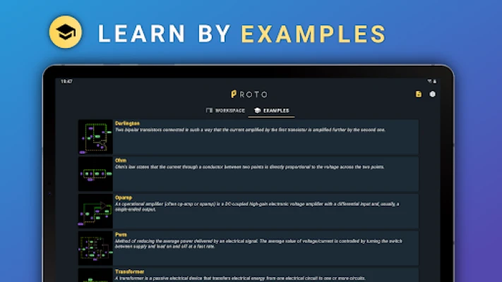 During simulation you can check voltages, currents and many other variables. Check signals on multichannel oscilioscope and tune your circuit in real time! Our app can greatly help with your Raspberry Pi, Arduino or ESP32 project. You can also use PROTO as logic circuit simulator and perform digital electronic analysis!