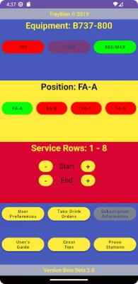 TrayBien functions in three separate steps: 1) select aircraft type and FA position which defines the assigned section, 2) take drink orders by typing in codes just as you would have written them down on paper, 3) assembling the delivery trays and associating drinks in the trays with seats in your section.