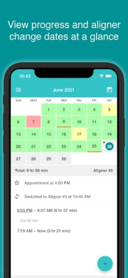 • At-a-glance view of your treatment in a calendar format with color-coded results of aligner wear