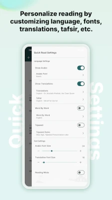 Explore authentic Tafsir and word-by-word Quranic verses translated in multiple languages for deeper understanding. Apply Tajweed for accurate recitation, and customize fonts and languages to suit your needs.